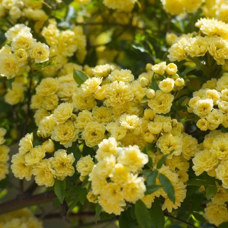 Puede alcanzar 6–10 metros si tiene soporte. Florece una sola vez en primavera, con muchísimas pequeñas flores dobles de color amarillo. Hojas pequeñas, verdes y decorativas todo el año en climas suaves.