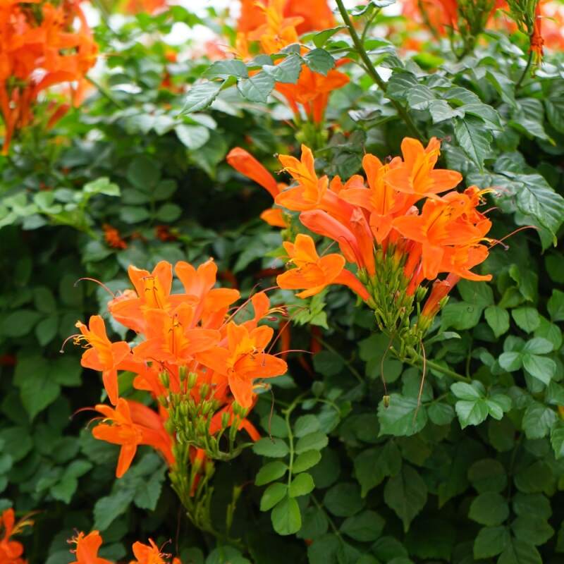 Trepadora perenne. Alcanza de 3 a 8 metros. Flores de color naranja. Se emplea como trepadora o como arbusto.