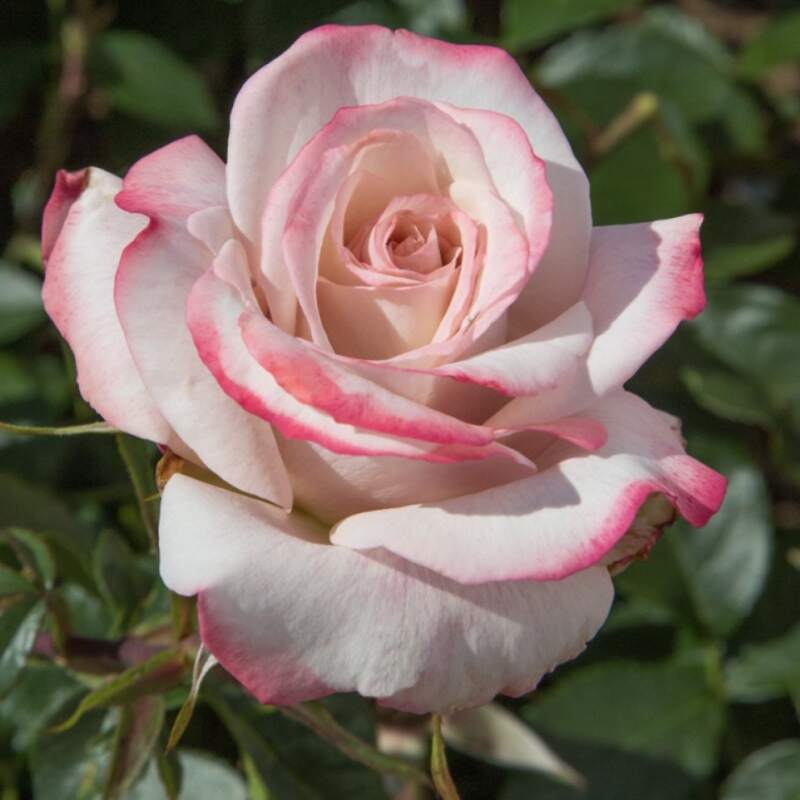 Rosier à grande fleurs d'une hauteur de 80cm. Fleurs de couleur rose pâle bordé de rose profond au parfum intense, épicé, verveine.