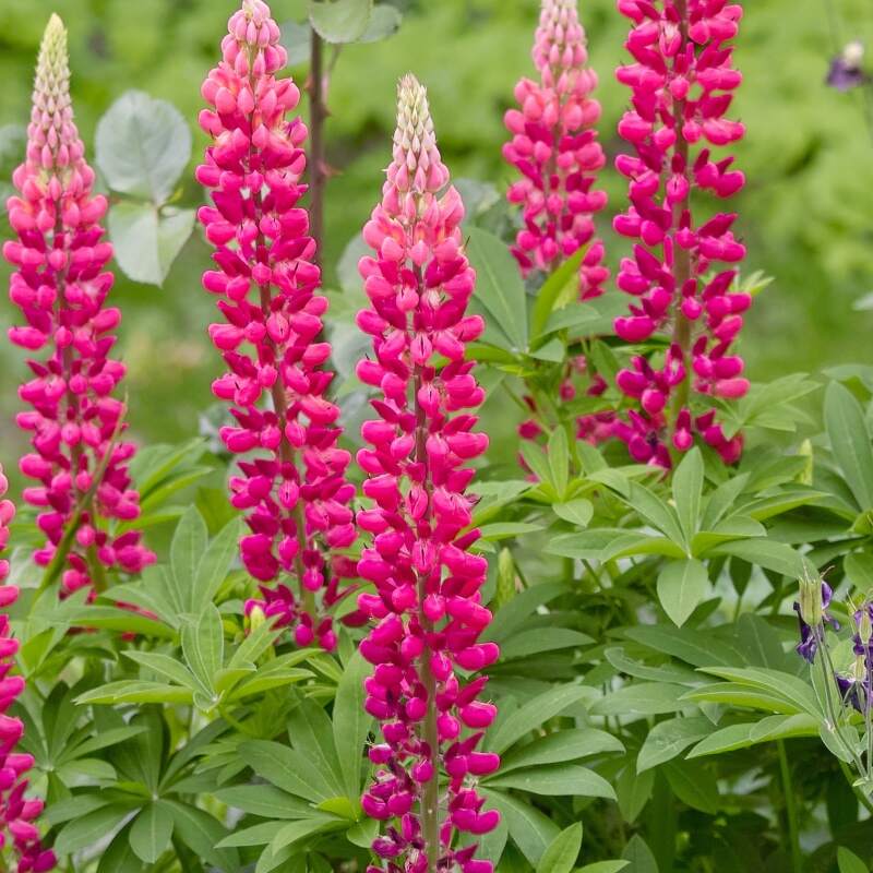 Tall perennial flowering plant (typically 1–1.5 meters high). Large palmate leaves with 9–17 leaflets (“polyphyllus” = many-leaved). Dense flower spikes in red. Blooms in late spring to early summer.