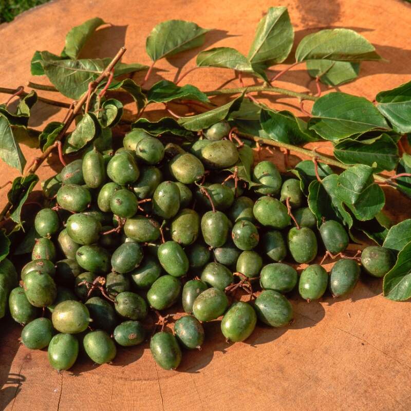Self-fertile kiwi. Harvest in 2-3 years. Smooth-skinned kiwis so thin that the fruit can be eaten with the skin. Green skin with a reddish tone.
