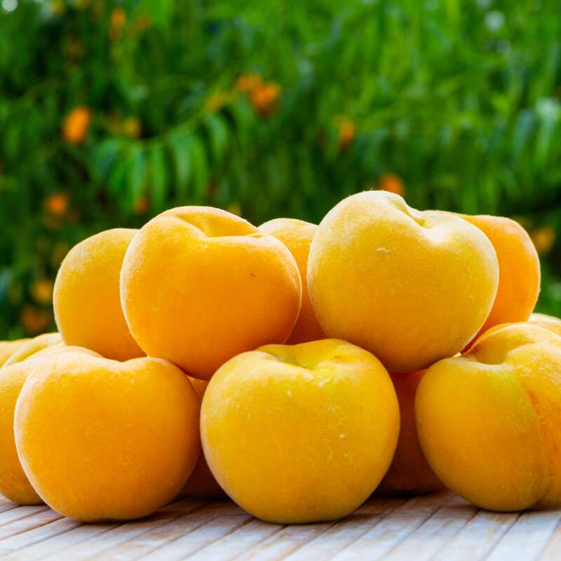 Grafted onto a rootstock. Round, slightly elongated fruit with yellow-red skin. Very juicy yellow flesh.